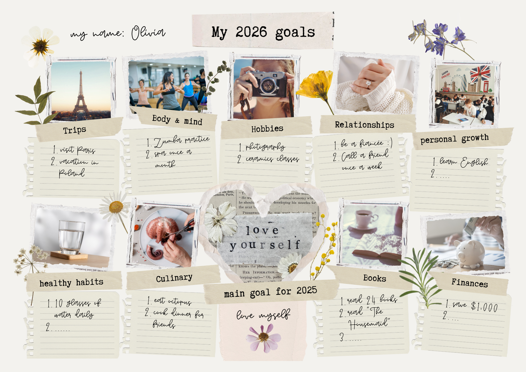 Plutôt que de multiplier les objectifs, je te propose deux alternatives plus douces et plus alignées : choisir un mot de l’année ou créer un vision board.